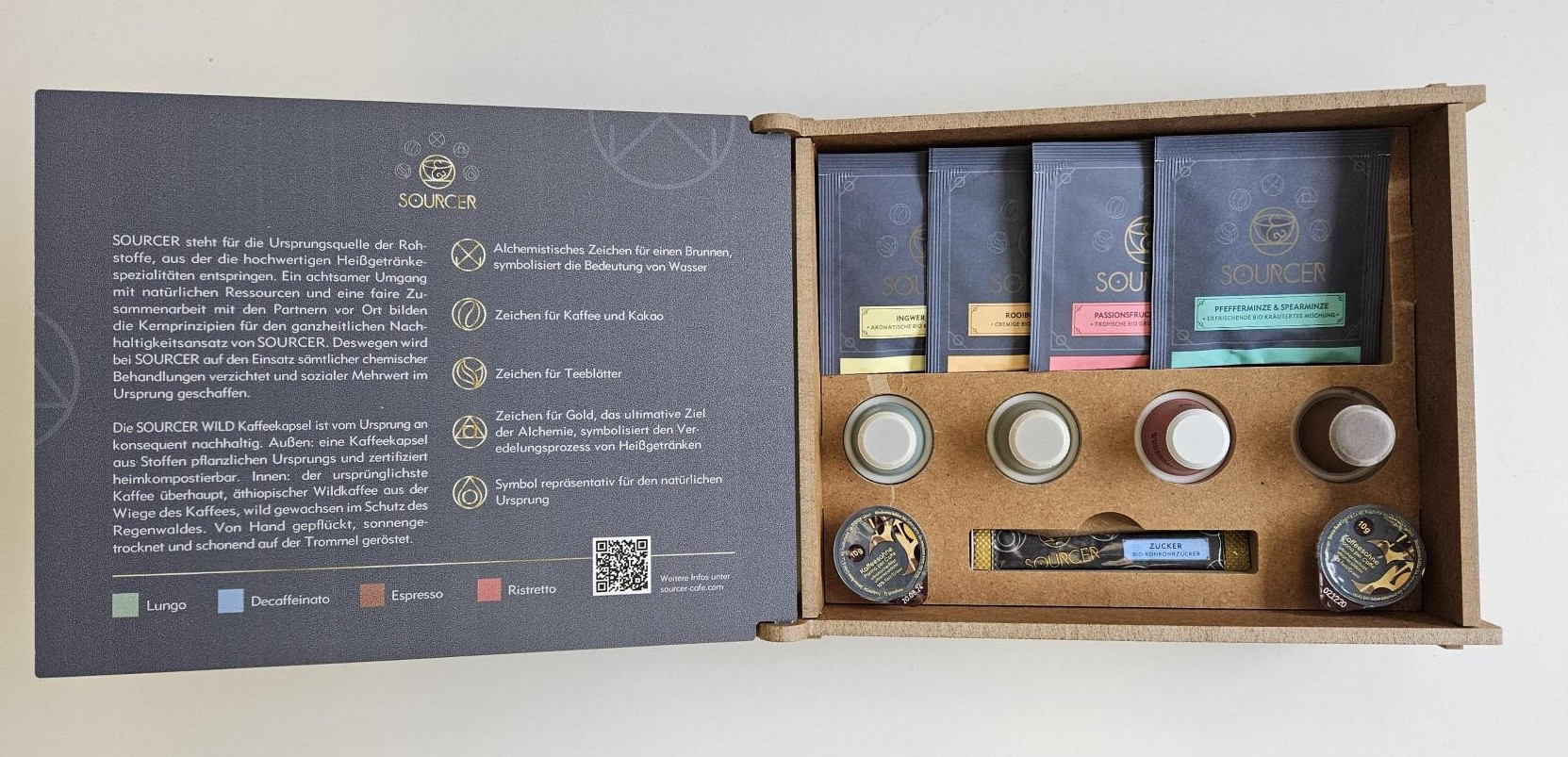 Das Display aus recyeltem Birkensperrholz wird in Norddeutschland produziert und kann mit Kaffeekapseln, Teebeuteln, Kaffeesahne und einem Zuckerstick befüllt werden.